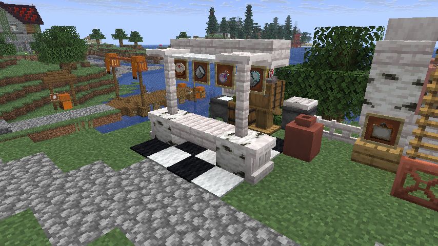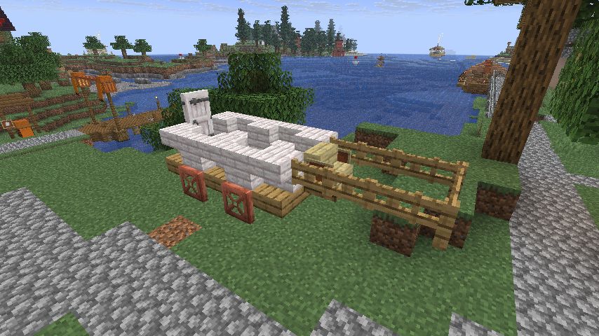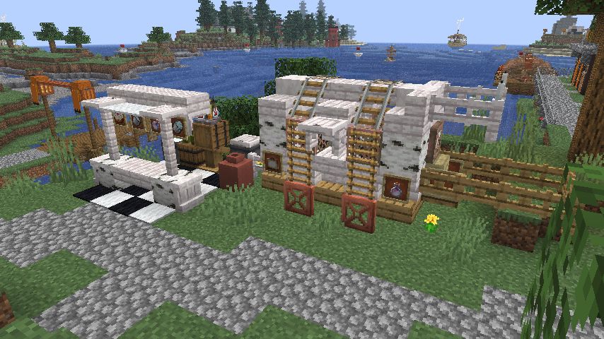 2. **構築**: 北大陸の街道沿いに移動式牛乳販売所を設置します。ベースは白い車体の普通の馬車です。
