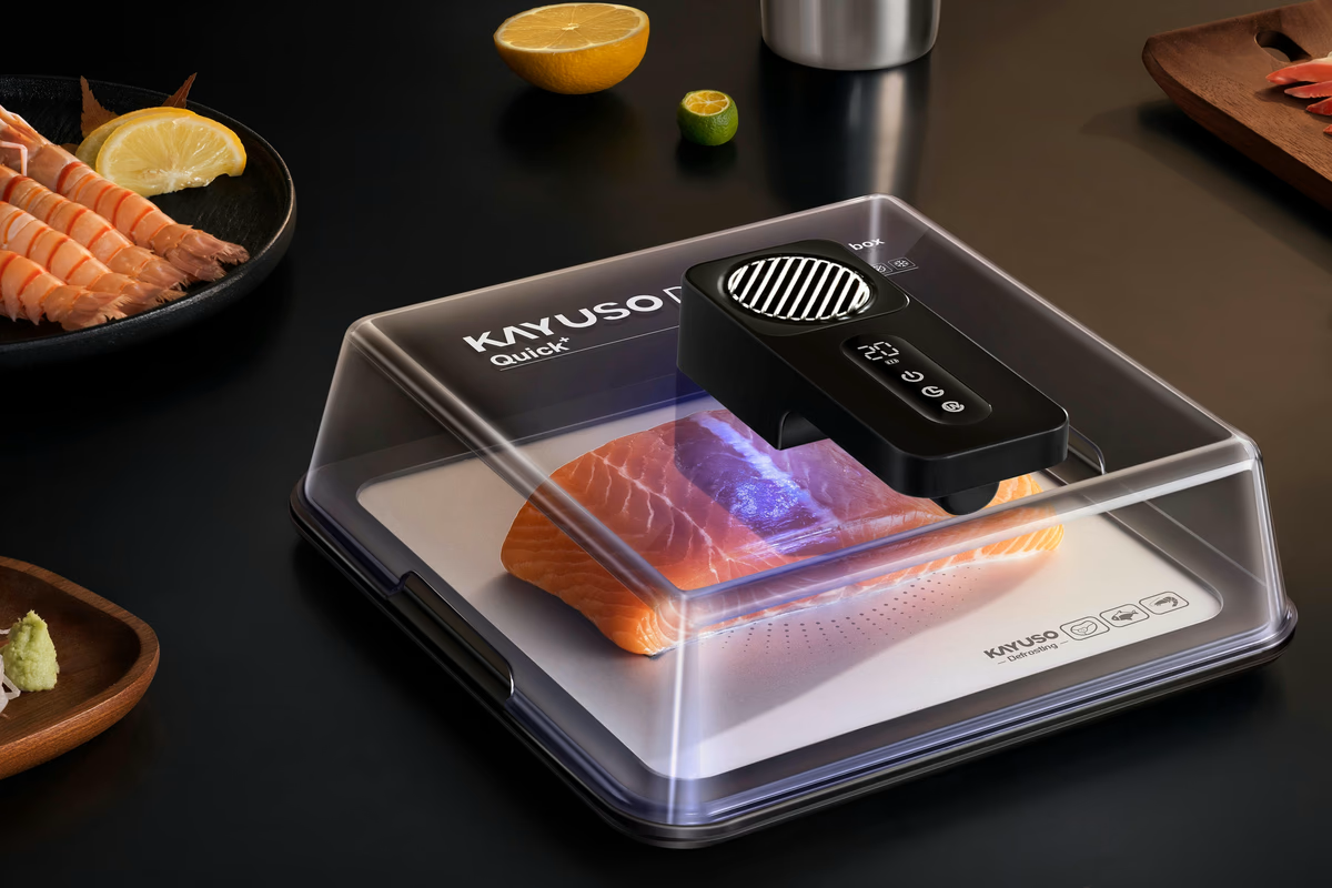 - 「KAYUSO Defrosting Box」:プラズマ解凍とUVC除菌を同時に行う家庭用キッチン家電。コードレスで持ち運び可能、容量4.2 L。
