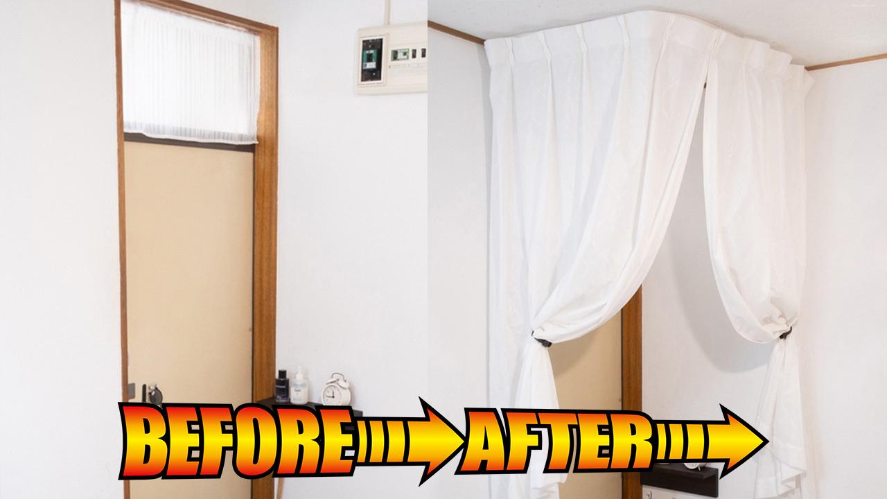 記事内の写真では、設置前は玄関が開放的で散らかった印象だったが、レールとカーテンを取り付けた後は視線が遮られ、部屋全体が統一感のある空間に変化している。