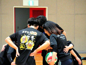 大学でバレーボールをしている時の一枚。南東北総体のTシャツを着ている中央左が天野さん