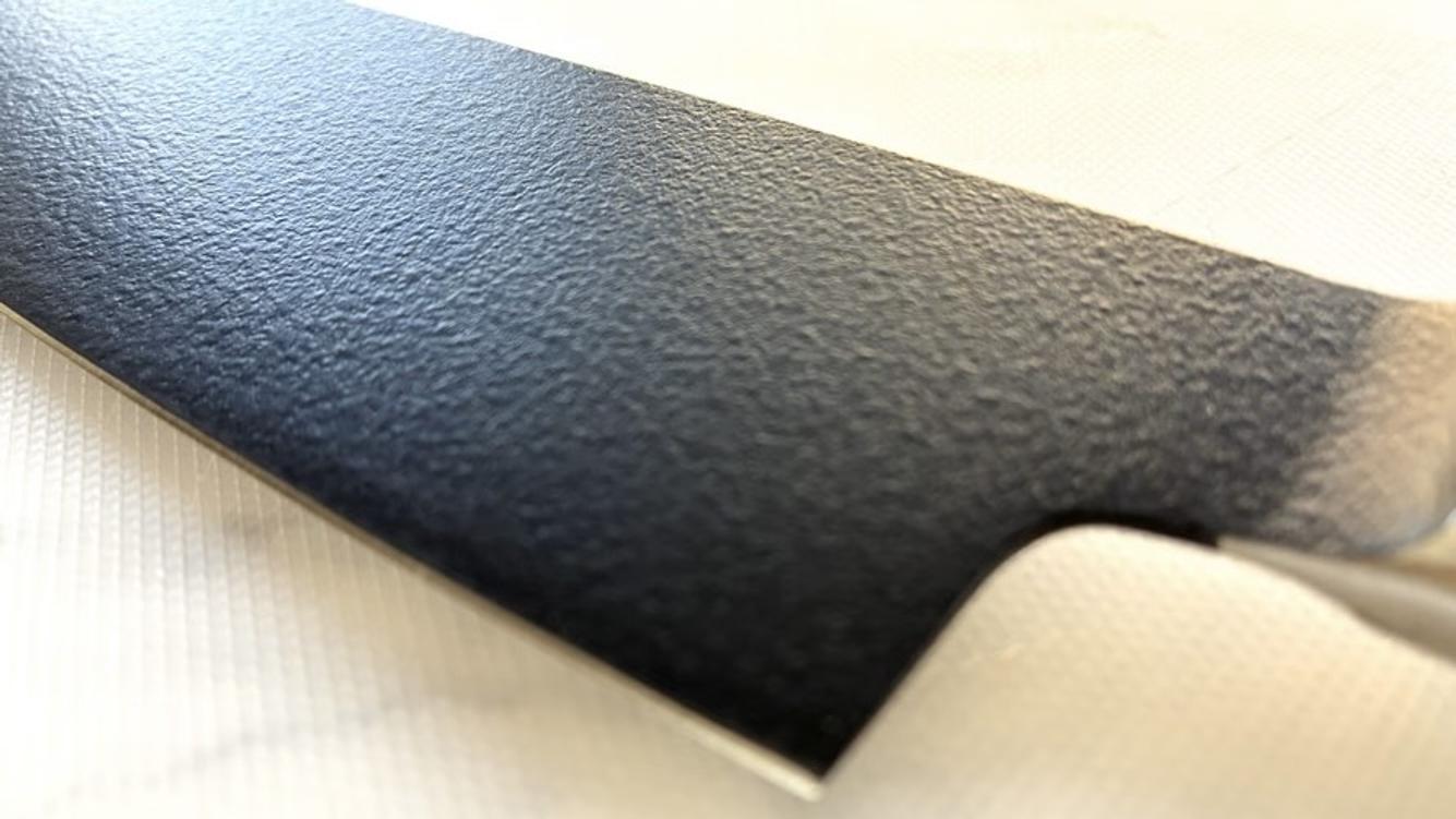 - 刀身にフッ素樹脂コーティングがあり、水分の多い野菜を切ってもくっつきにくく、形を崩しにくい